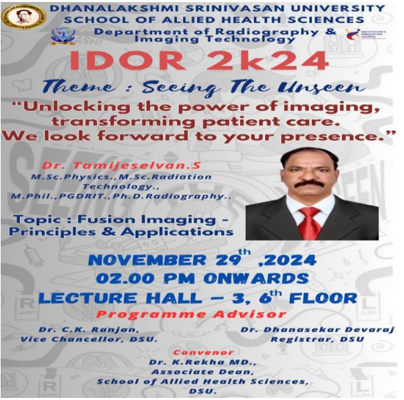 Under the guidance of Vice Chancellor Dr. C. K. Ranjan, Registrar Dr. Dhanasekaran Devaraj and the presence of esteemed dignitaries further elevated the event Dr. K. Rekha Associate Dean, School of Allied Health Science who lent their support and time and reinforced the university’s commitment to academic excellence and innovation. The event drew a diverse audience-comprising faculty and students from the School of Allied Health Sciences. Mrs. Annie Portia Assistant professor welcomed the gathering present.Next to that, III-year student Jeevitha invited the chief guest to give a lecture. our chief guest, Dr. Tamijiselvam M.Sc. Radiation Physics, PhD Radiography Assistant professor started his guest lecture on the topic of "Fusion Imaging- Principle and applications ". Students of Radiography and imaging technology gained knowledge about current practice in PET-CT and PET-MRI. His lecture helped the attendees to understand the Fusion imaging.