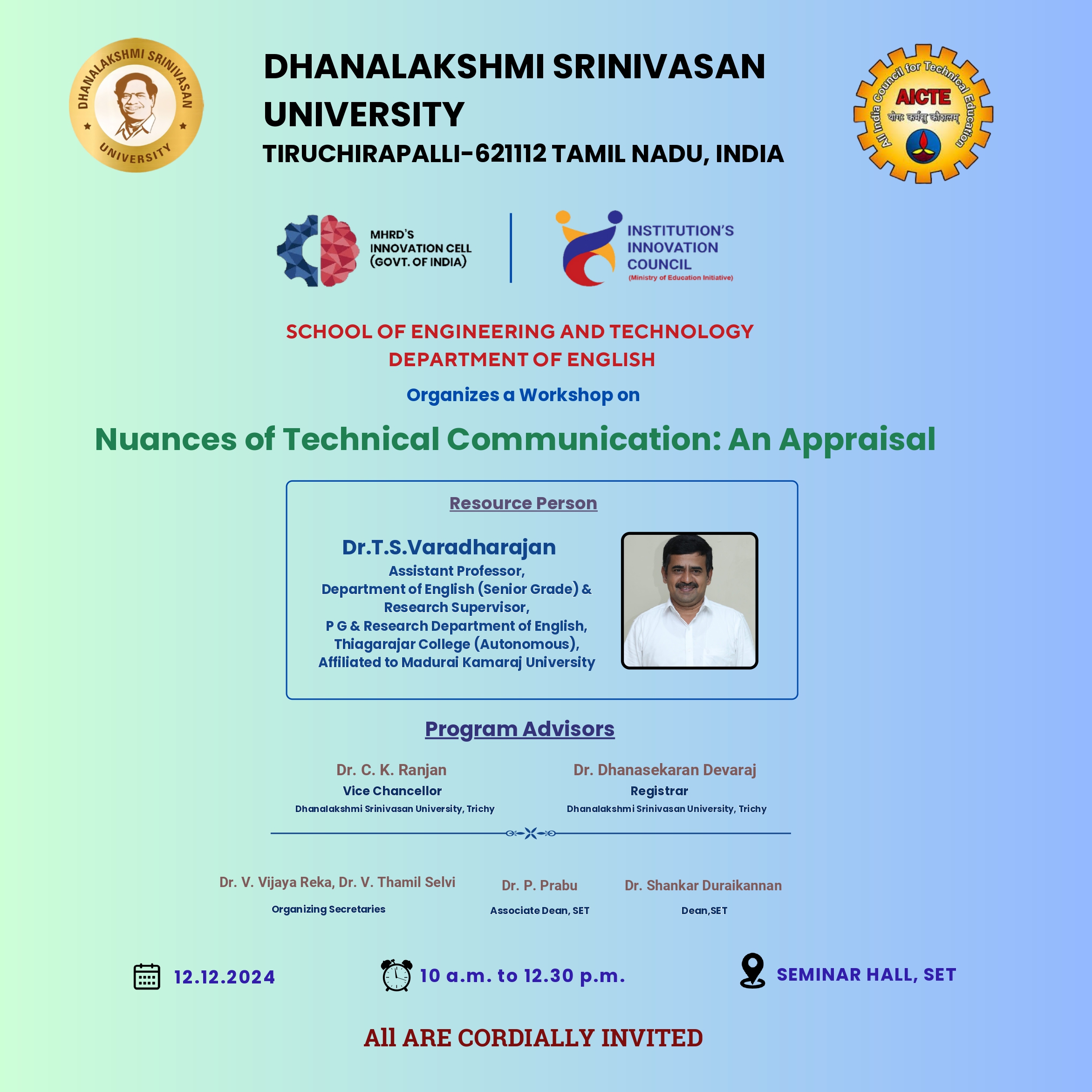 gathering. The resource person, Dr. T.S. Varadharajan, Assistant Professor, Thiagarajar College,Madurai, introduced the fundamental principles of technical communication to first-year engineering students. He also covered the purpose in technical communication and practicing active listening and feedback. The workshop received overwhelmingly positive feedback from participants, who appreciated the interactive and engaging approach. The workshop ensured that the students not only gained knowledge but also developed essential skills to enhance their technical communication abilities. Dr.V.Vijaya Reka, Assistant Professor, Department of English, gave the vote of thanks.