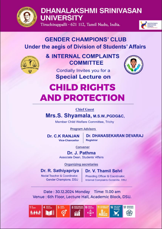 Helpline : +91 63841 76766 | 63841 76769The Gender Champions’ Club and the Internal Complaints Committee organized a speciallecture on “Child Rights and Protection” for the students of the university in the SeminarHall, School of Engineering and Technology on 30.12.2024 at 11 a.m. Around 200 studentsfrom various schools of the university attended the programme. Dr. V. Thamil Selvi, Presiding Officer, the Internal Complaints Committee welcomed the gathering. A pledge against child marriage was taken by all the students and staff members present in the hall. The Vice-Chancellor, Dr. C.K. Ranjan, and the Registrar Dr. Dhanasekaran Devaraj gave away cash awards to the winners of ICC FEST 2K24. The guest speaker, Mrs. S. Shyamala, Member,Child Welfare Committee, Trichy, emphasized that Child rights and protection are fundamental to ensuring a safe and just society for children, encompassing their rights to survival, development, participation, and protection. Despite these frameworks, children