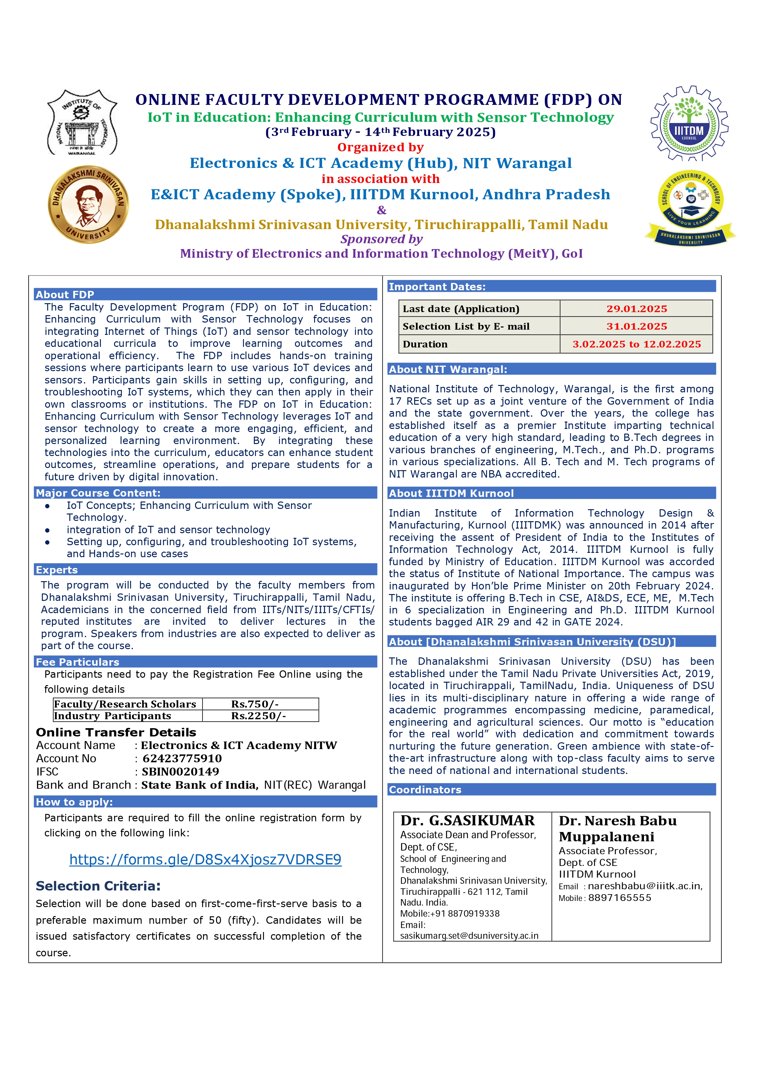 It gives us immense pleasure to invite you to participate in the Online Faculty Development Program (FDP) on IoT in Education: Enhancing Curriculum with Sensor Technology, organised by Dhanalakshmi Srinivasan University, Tiruchirappalli, Tamil Nadu.