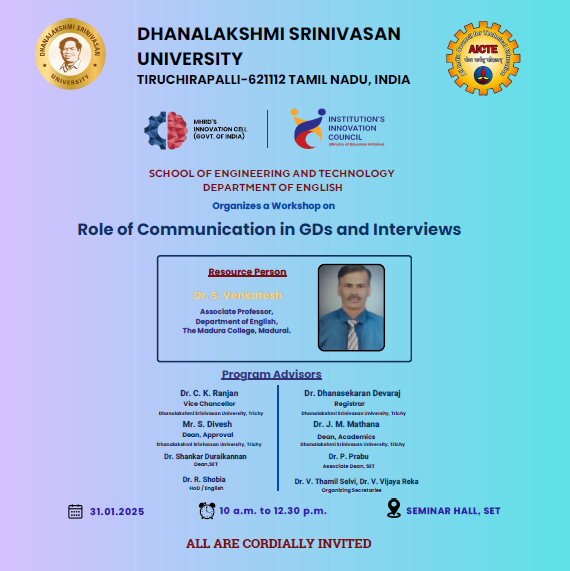 The Department of English organized a workshop on “Role of Communication in GDs and Interviews” on 31.01.2025 at 10.00 am in the Seminar Hall, II Floor, SET Block, Dhanalakshmi Srinivasan University, Trichy. Dr. P. Prabu, Associate Dean welcomed the gathering. The resource person, Dr.Shankar Duraikannan, Dean/ SET honoured the chief guest and felicitated the gathering. Today’s resource person Dr. Dr.S.Venkatesh, Associate Professor, Department of English, The Madura College, Madurai, delivered a comprehensive and engaging address on the role of communication in GDs and interviews. He also emphasized the importance of pronunciation and fluency in spoken English. He encouraged participants to practice tongue twisters to improve their articulation and confidence. The workshop received awesomely positive feedback from participants, who appreciated the interactive and engaging approach. The workshop ensured that the students not only gained knowledge but also developed essential skills to enhance their employability skills. Dr.V.Thamil Selvi, Associate Professor, Department of English, proposed the vote of thanks.