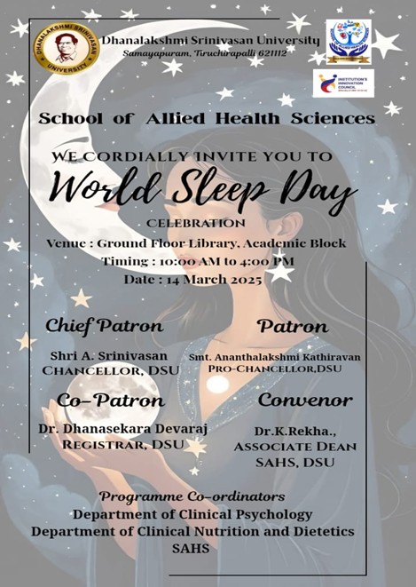 The ‘WORLD SLEEP DAY CELEBRATION’ was organized by the Department of Clinical Psychology and clinical nutrition and deictics, School of Allied Health Sciences, Dhanalakshmi Srinivasan University Samayapuram, Trichy to create an insight about the ‘Importance of sleep in relationship with the mobile addictions and obesity’ on 14th March in Ground floor library, Academic block, between 10 am to 4.00 pm.