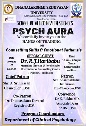 The ‘PSYCH AURA’ HANDS ON TRAINING ON COUNSELING SKILLS AND EMOTIONAL CATHARSIS Programme was organized by the Department of Clinical Psychology, School of Allied Health Sciences, Dhanalakshmi Srinivasan University Samayapuram, Trichy to create an insight about the Counselling skills and emotional healing on 19th to 20th march 2025 in Lecture hall II, 3rd floor, between 10 am to 4:30pm.