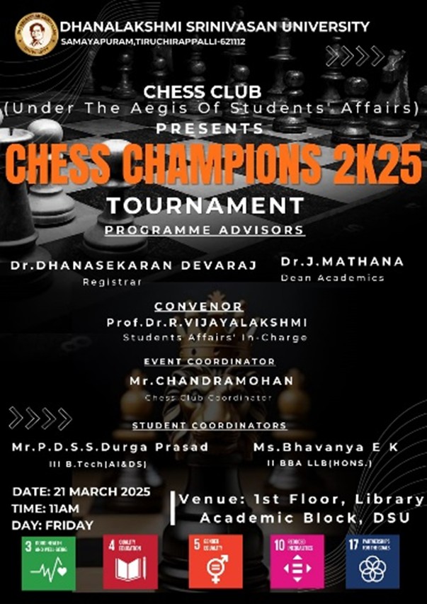 The Chess Club under the aegis of Students' Affairs, Dhanalakshmi Srinivasan University, proudly hosted the Chess Champions 2K25 tournament on March 21, 2025. This highly anticipated event provided a platform for chess enthusiasts from diverse academic disciplines to engage in a friendly yet intellectually stimulating competition.