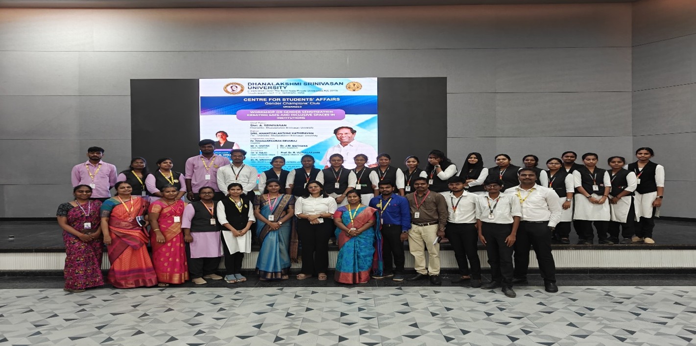 The Gender Champions’ Club of Dhanalakshmi Srinivasan University, under the guidance of the Centre for Students’ Affairs, organized a Workshop on Gender Sensitization: Creating Safe and Inclusive Spaces in Institutions on 2nd May 2025, at 6th Floor Lecture Hall, Academic Block.