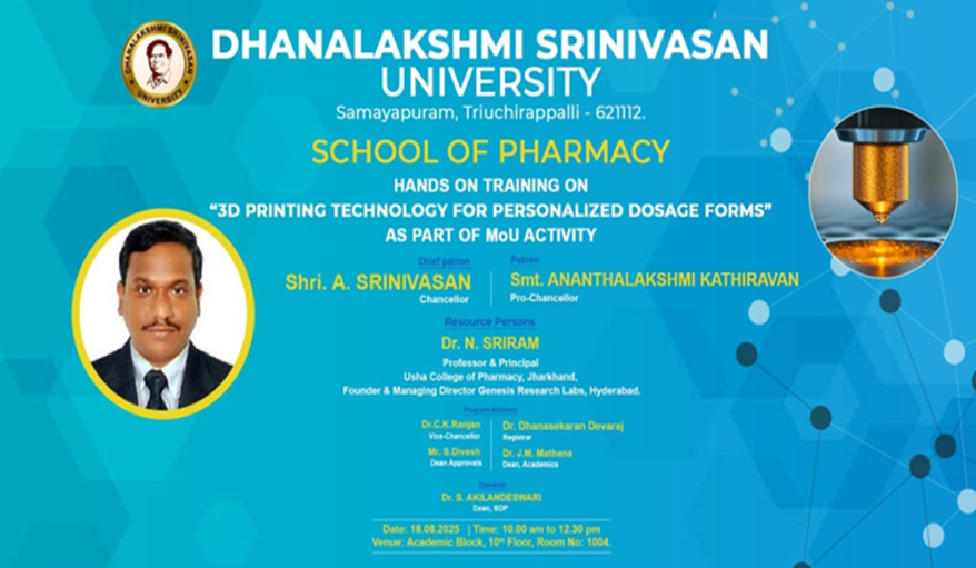 As part of the Memorandum of Understanding (MoU) activities, the School of Pharmacy organized an insightful hands-on training session on “3D Printing Technology for Personalized Dosage Forms” on 18th August 2025 from 10:00 a.m. to 12:30 p.m.