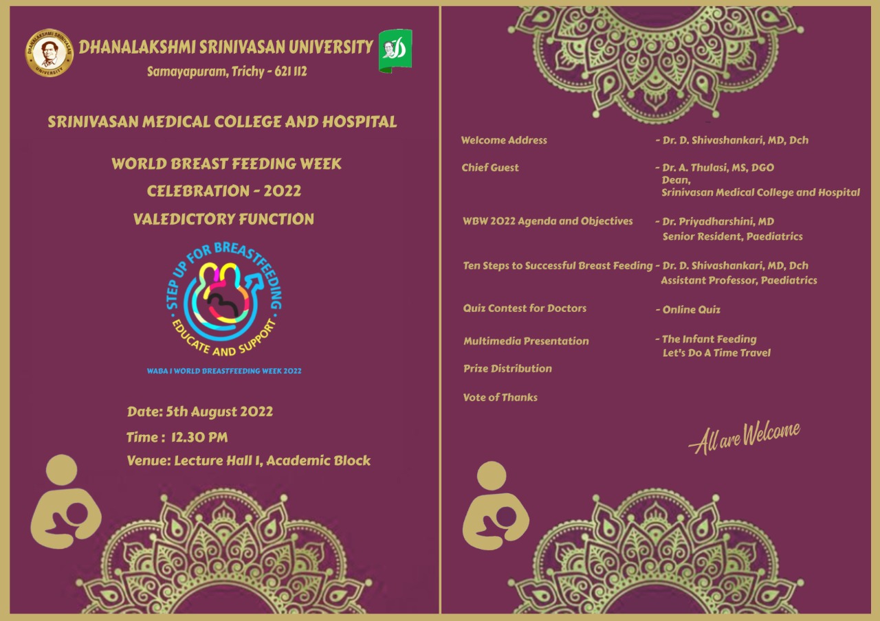 On the occasion of breast feeding day DHANALAKSHMI SRINIVASAN UNIVERSITY has been conducted a rally at samayapuram .students from all the schools PMS has been participated in the rally to create the awareness and importance of breast feeding towards the people.
